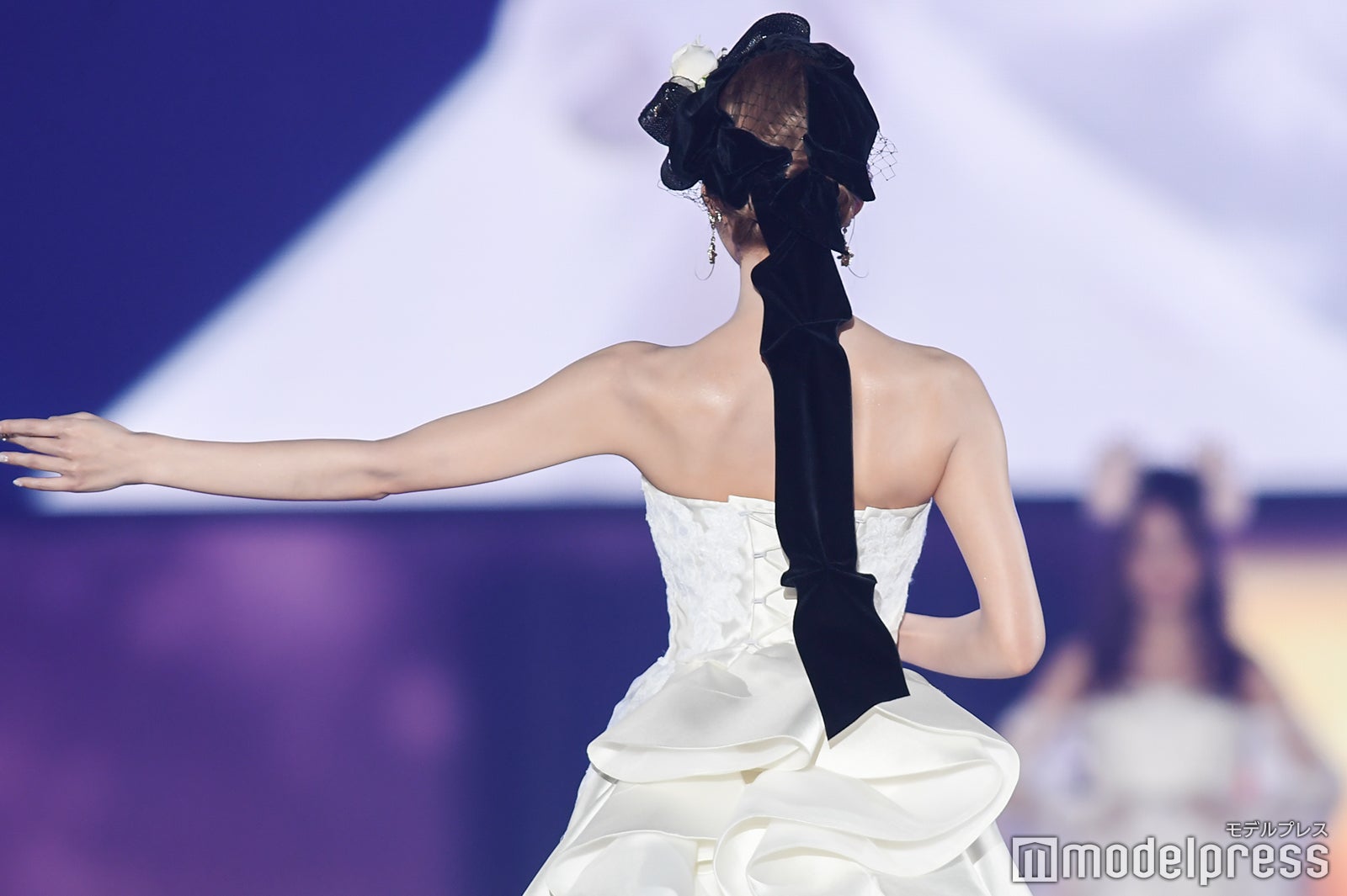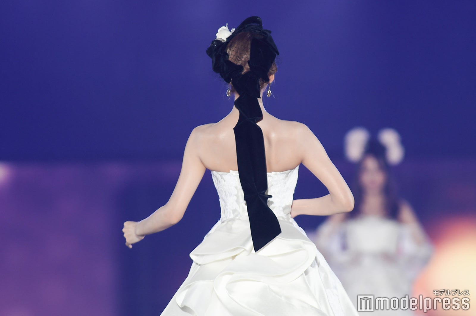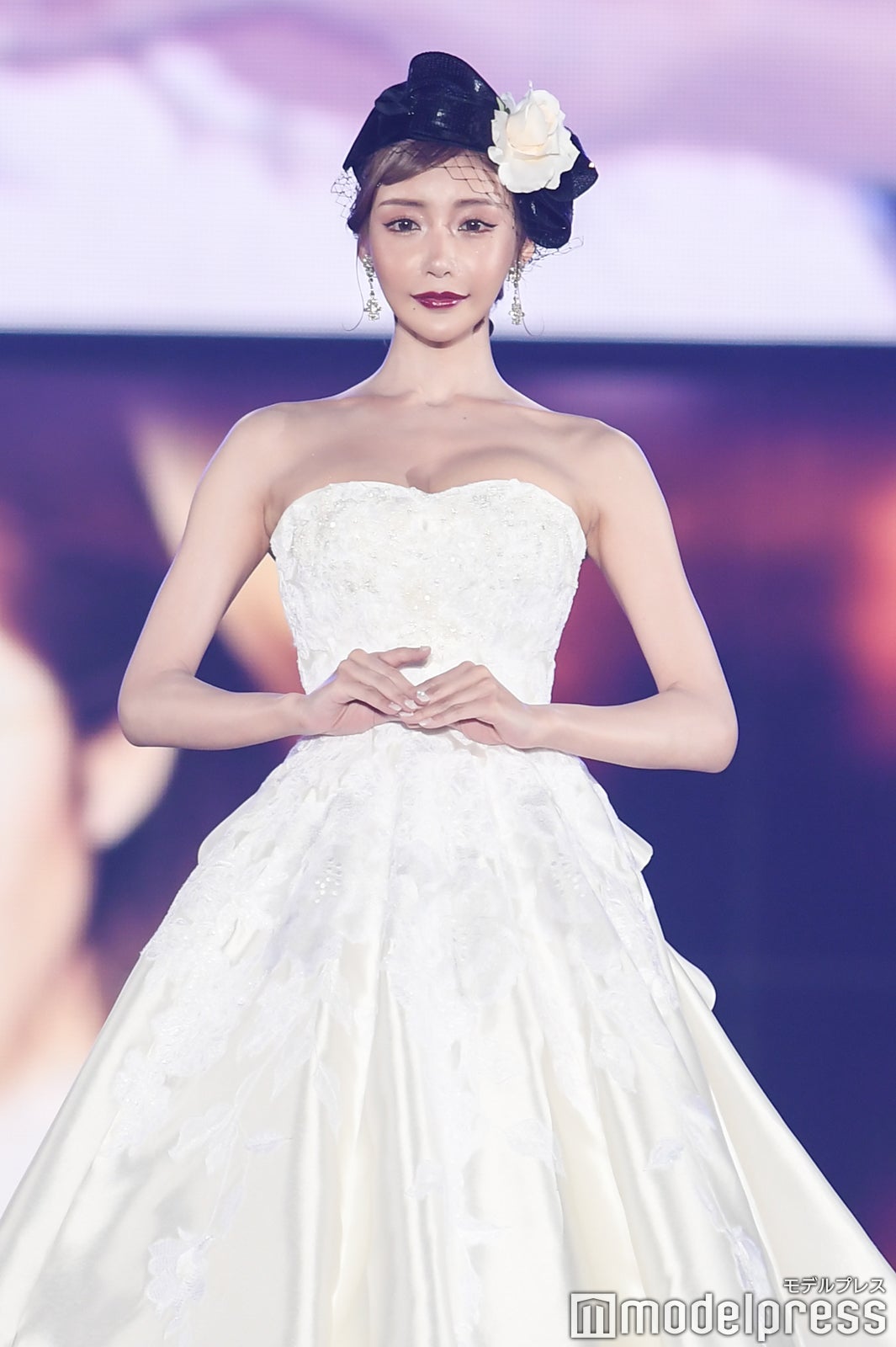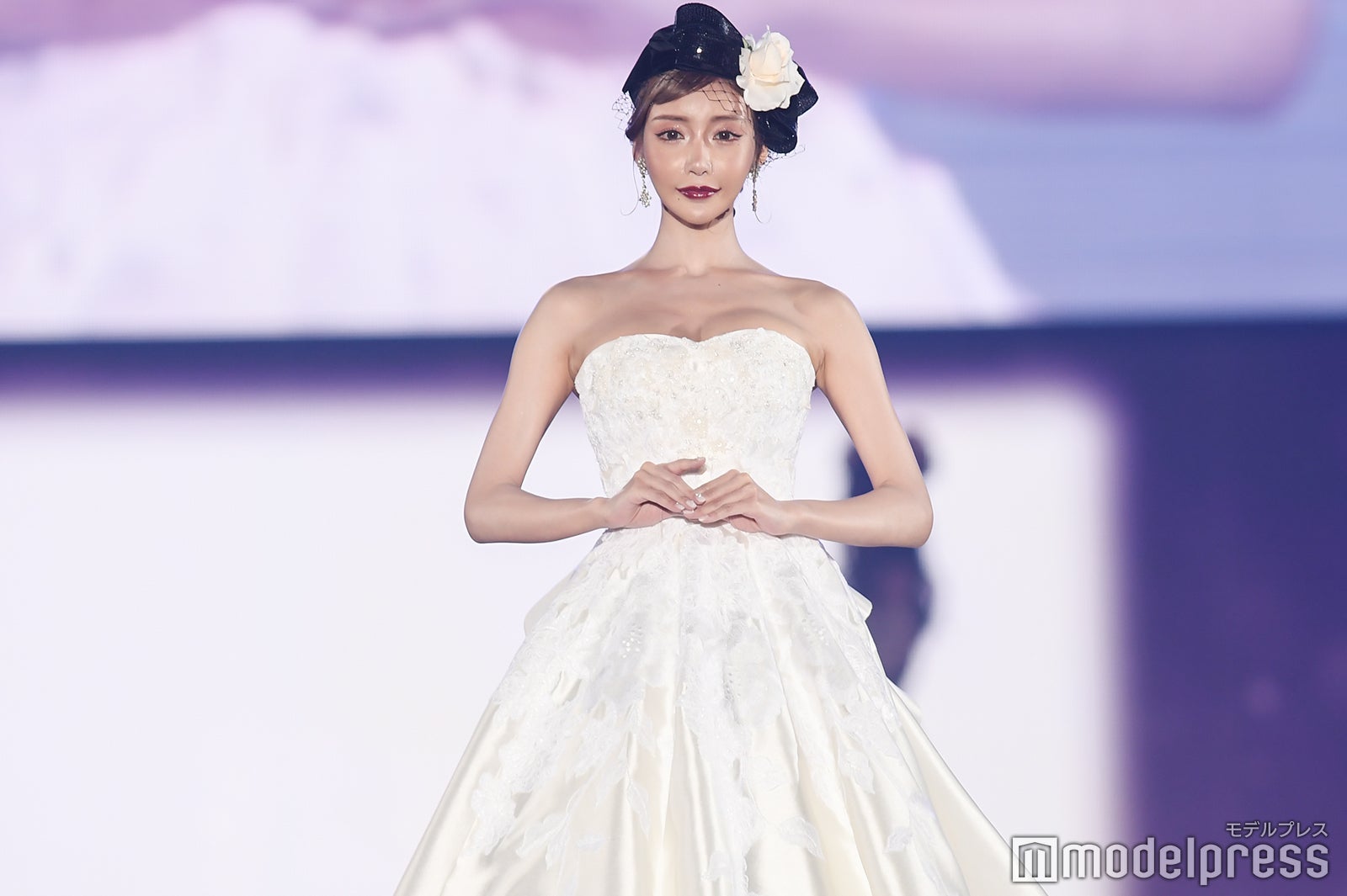 「エンリケ空間 Supported by FOUR SIS & CO.」のステージに登場した明日花。ボリューム感のあるゴージャスな純白ドレスに身を包み、ヘアスタイルは黒の髪飾りでシックにまとめた。