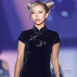 「みちょぱの妹分」とも言われる次世代カリスマギャルモデル、華。「NieR CLOTHING」のステージに登場し、太ももまでスリットが入ったセクシーなブラックのチャイナドレス姿を披露し、美しいボディラインで颯爽とウォーキングを披露した。髪は可愛らしくお団子を2つにくくりキュートに決めている。