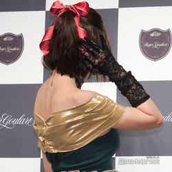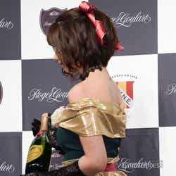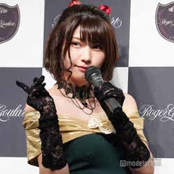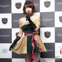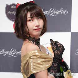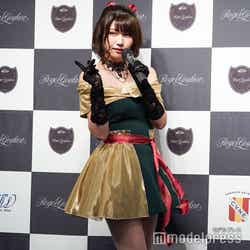スパークリングワインのボトルをイメージしたミニドレススタイルで登壇したえなこは、「リボンとかもすごく可愛い感じになっています」、「ラグジュアリーで、豪華な感じがポイントです」と声を弾ませた。えなこ、コスプレに挑戦したいキャラクターは?