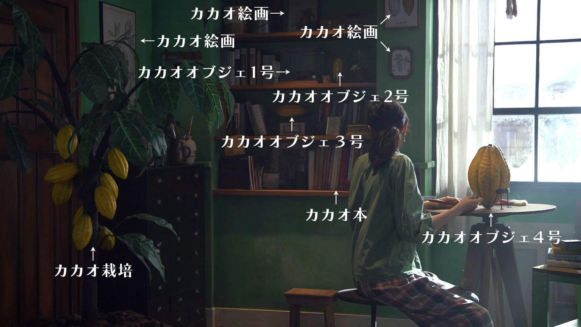 「カカオを愛しすぎている人」「カカオにまつわる色々なものを収集している人」という、ちょっと変わった設定の新垣が、「カカオポッド」を制作し始めるシーンからスタートする今回のCM。そして、それだけでは飽き足らず、「特大のカカオポッド(全長130cm)」まで制作し始めてしまう新垣。特大の「カカオポッド」を抱きかかえながら全身で持ち上げるユニークな演出や、特大の「カカオポッド」の上に商品をのせた後の、「いいね!」というチャーミングな仕草が見どころとなっている。
