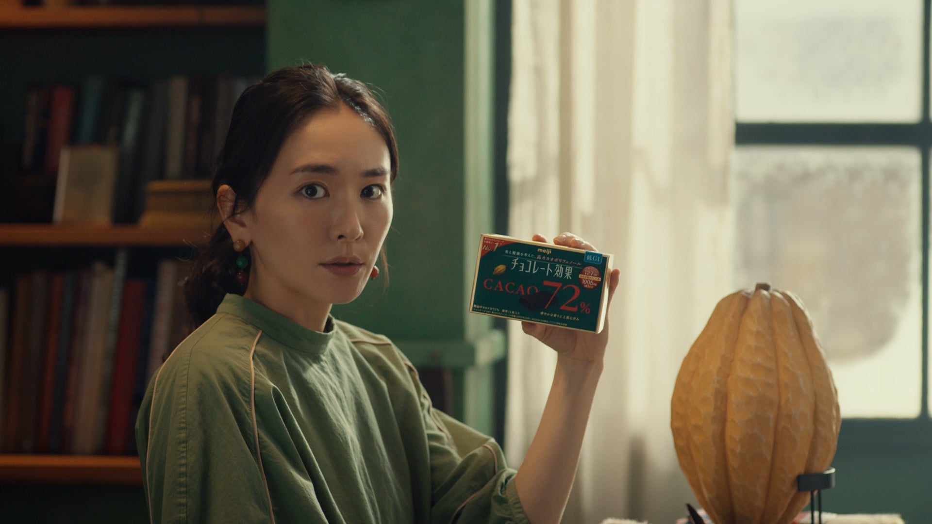 ― CM撮影を終えての感想をお願いします。新垣:この商品のCMは、いつもちょっと変わった雰囲気というか、淡々とした空気のCMが多くて、今回も雰囲気はそのままです。今回の撮影はすごく大きい模型も造ってしまうぐらい、カカオを愛しているという設定なんですけど、前回は大きい時計になったなと思っていて、その前は大きいギフトボックスと共演しましたね。大きいものと共演するシリーズがたまたまだと思うんですけど、続いてるなという印象です。今回も楽しかったです。