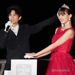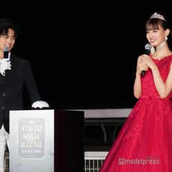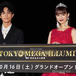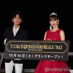女優の鶴嶋乃愛が15日、東京・大井競馬場で開催された「東京メガイルミ 2021-2022 点灯式」に俳優の奥野壮と出演し、深紅のドレススタイルを披露した。