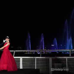 馬車に乗って登場した鶴嶋は、ステージにあがると、「真っ赤な目立つドレスということですが、リボンであったりなど可愛さがあって、私もすごく気に入っています」とにっこり。リクエストに応えて、1回転しながらドレス姿を披露した。「私は馬車に乗るのが初めてだったのですが、こんなにお姫様みたいに、胸がいっぱいといいますか、嬉しい気持ちでいっぱいでした」と声を弾ませ、「本当に童話の中のプリンセスみたいな気持ちでした」と胸をトキメカせる一幕も。