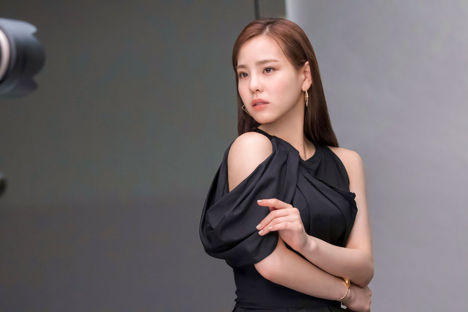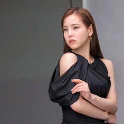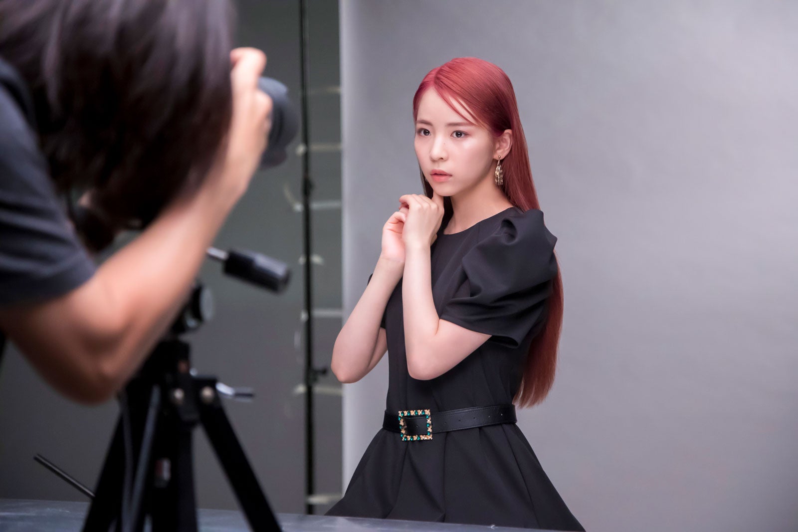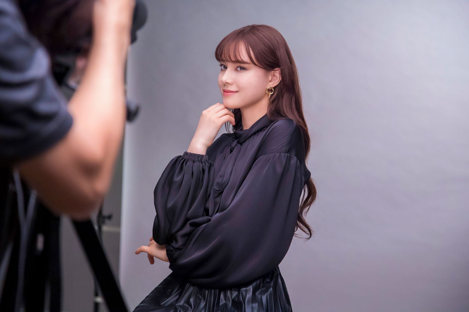 高めのピンヒールに、ウエストのベルトが印象的な黒いドレスに身を包んだRIMA。大きく目を見開いた状態をキープするシーンでは、思わずまばたきをしてしまい「すみません…(苦笑)」と、おちゃめなNGシーンも。撮影中、カメラマンから「キレイ!」と褒められると、カメラに向かってgoodサインを見せ、撮影を楽しむ様子を見せた。RIO、緊張見せるもクールな表情で魅了