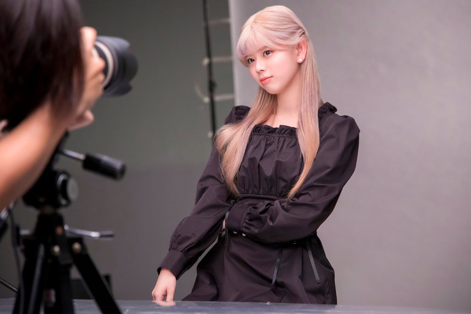 “NiziU No.1の緊張しい”だというRIO。「1人になって(注目されると)急に暑くなって…(笑)」と顔まわりをパタパタとあおぐ。いざ撮影が始まると積極的にスタッフへ動きを確認し、練習を重ねる。終盤、自由なポージングを求められるとクールな表情を繰り出し、当初の緊張を感じさせない余裕を見せた。MAKO、無茶ぶりにも完璧に対応