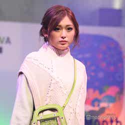 ファッション誌「egg」の専属モデルであるゆうちゃみは、「水と緑 SDGs」をテーマとしたステージに登場。ニットやコート、ピアスからバッグといった小物までサステナブル素材にこだわったスタイルで、存在感のあるランウェイを披露した。
