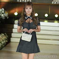 聖菜は、Tika&GROSSが展開するキャバドレス最大手アパレルブランド「Tika(ティカ)」ステージに、華やかなドレス姿で登場。ミニ丈からすらりと伸びる美脚を披露し、白いピンヒールを履きこなして、堂々のウォーキングを見せた。
