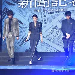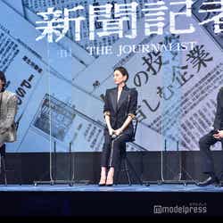 MCを務めたトラウデン直美から「役作りは大変だっただろうなと感じました」と声をかけられた米倉は「そうですね。今回は藤井監督と一緒に新聞社で働く記者さんのところにお伺いして、1日だったんですけど、気が付いたらかなり長い時間、いろんなフロアーを紹介していただいたり、実際に記者さんにお話をうかがったりして、どんな立ち位置で、どんな気持ちでお仕事をされているのかという取材をさせていただきました」と明かし、強いヒロインを数多く演じている米倉だが「私は最初、強いキャラクターを作っていこうと思っていたんですけど、(撮影に)入ってすぐ、官房長官を攻め立てるシーンをやっているときに、その時点で監督がちょっと違うみたいな感じで、ある方に取材をしに行くシーンももっと強く、今まで通り失敗しない女というよりは『負けない!絶対聞いてやる』という強さを表に出して、圧力でいこうとしたら、『ヨネさん、違うんです。もっと声も小さく静かでいいんで』って。私の構想をすべてぶち壊されたんですけど、新しい役の姿をいただけたなと思って感謝しています。(今回は)地味な戦うヒロインです」と語った。綾野剛、オファーを受けた理由に「米倉さんの瞳」