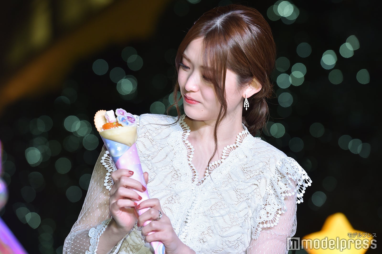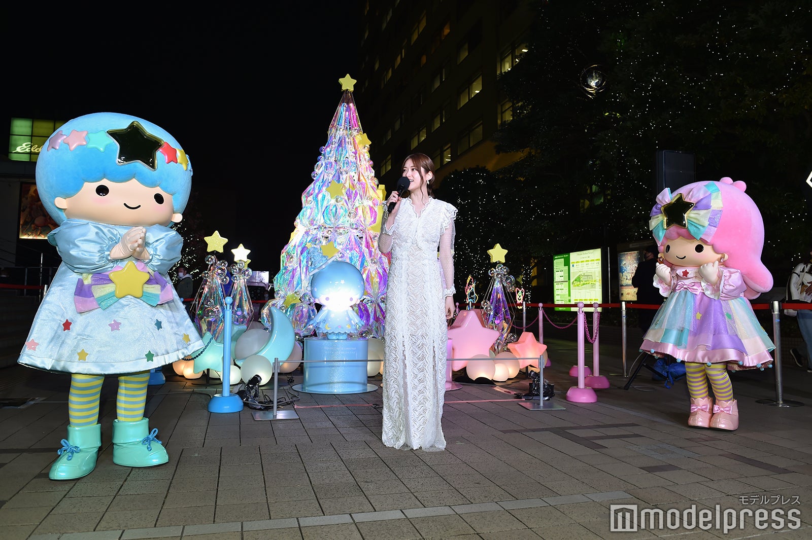松村沙友理、スリット入りエレガントな白ドレスで点灯式 “昔から大好き” キキ&ララと初共演で興奮