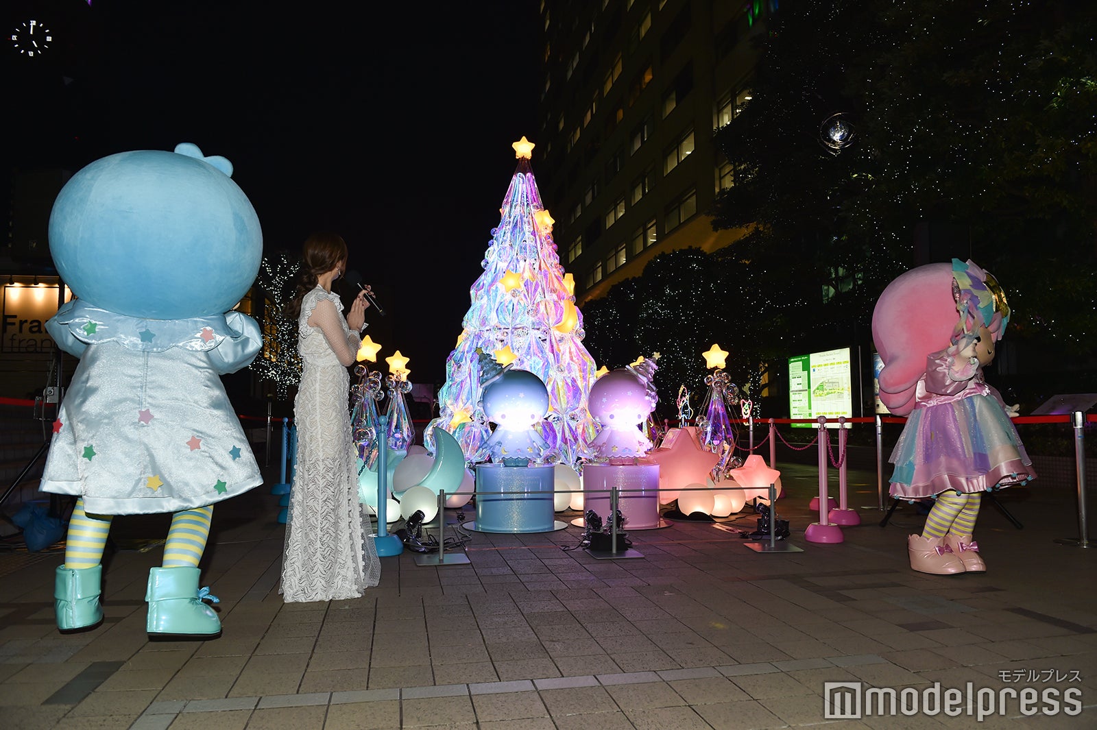 昨年初開催の「TWINKLE COLOR CHRISTMAS」が好評につき今年も開催決定。高さ約4mの巨大クリスマスツリーは、昨年に引き続きインスタレーションアート集団「MIRRORBOWLER」とのコラボレーションで、今年はキキ&ララのお友だちで、スヤスヤランドの王子様・ネムリンも登場した新しいデザインとなっており、昼間の太陽の下でもキラキラと輝くことが特徴となっている。陽も落ち、気温がグッと下がってきた中、レース調の純白ドレス姿で登場した松村は「嬉しいです!こんなにかわいいところに呼んでいただけて」と笑顔を見せ、キキ&ララとの共演の有無を尋ねられると「初めてですね。はじめまして。わーい!」と両隣に並んでいるキキ&ララに挨拶。ちょこまかと動き回るキキ&ララを見て「かわいいー!」とメロメロになっていた。