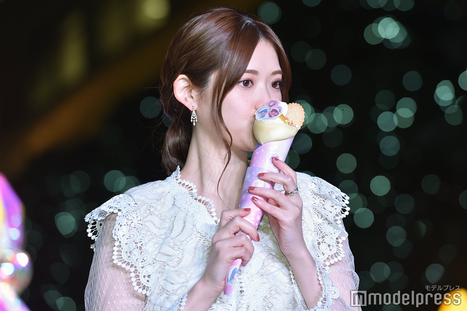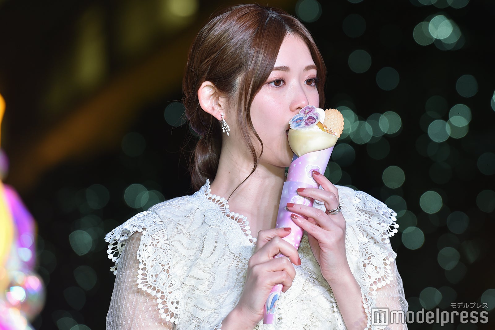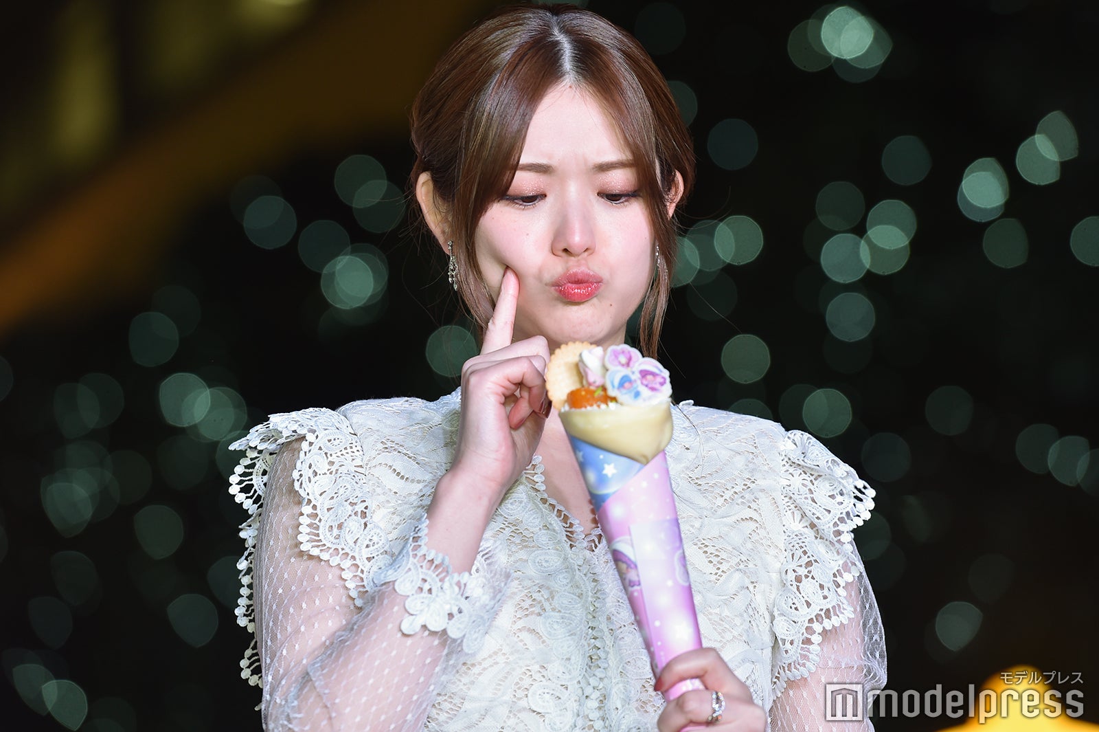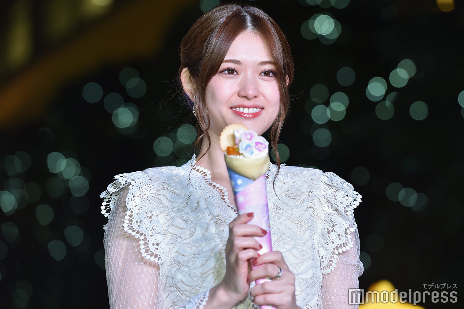 さらに、ツリーを見ての感想を求められると「すごくかわいいですね。あまり見たことのない感じの特別なツリーだなって気がします」と答え、ララが星のステッキを振って点灯することが紹介されると、松村は「ララちゃんなら絶対に大丈夫だから頑張って。応援してるね」とエールを送り、ツリーが点灯されると「点灯されていないときも十分かわいいと思ったんですけど、(点灯されると)カラーが変わるのが見ていて飽きない感じがしますし、より一層キラキラしていてかわいいです」と声を弾ませた。また、同所で食べることができる限定クレープが用意されると、松村は「嬉しいー!見た目もめっちゃかわいい」と目を輝かせ、口を尖らせてどこから食べようか迷いつつ、側面にかぶりつくと「あまーい!甘くて、たくさんトッピングが乗っていて、キキとララちゃんみたいでとてもかわいかったです」と頬を緩めた。最後に、同イベントの感想を聞かれた松村は「昔から大好きなキキ&ララちゃんと一緒に、こうやって点灯式に来られてとても幸せでした」と満足げな表情を浮かべ、会場をあとにした。(modelpress編集部)