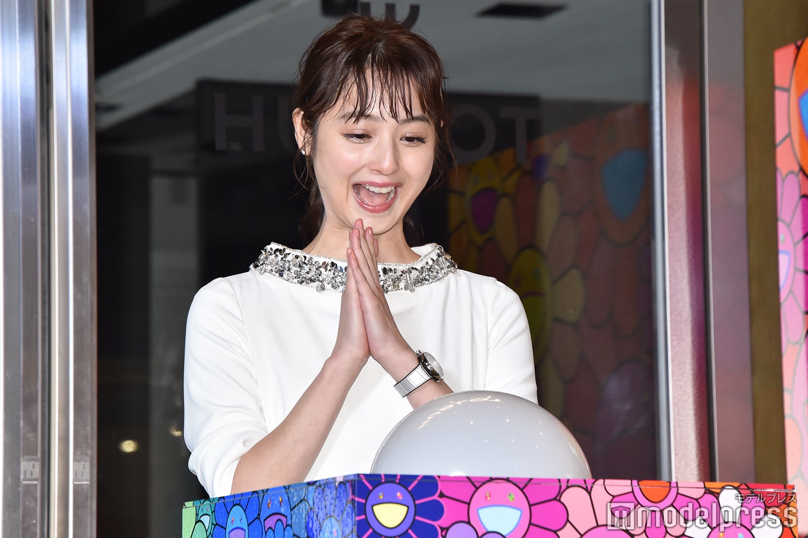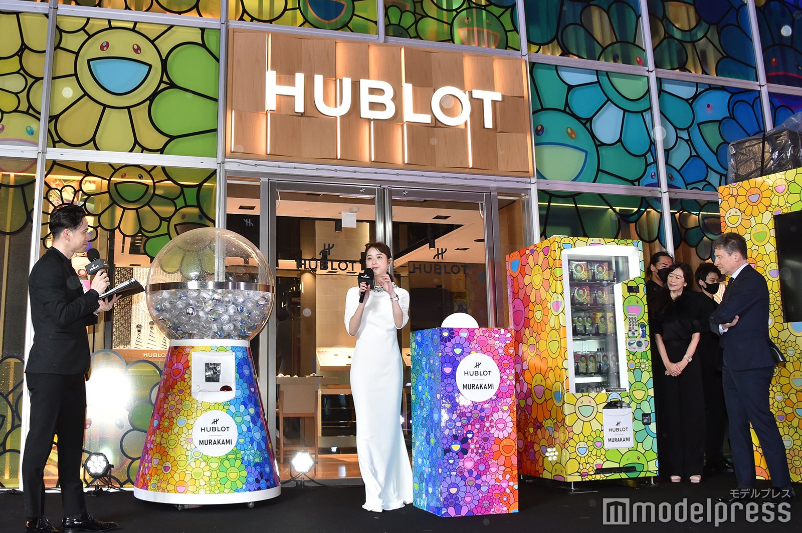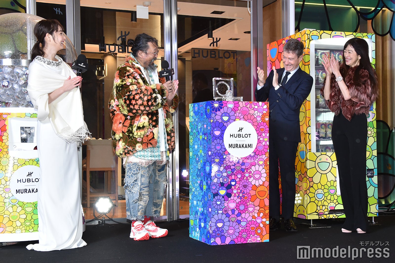 冷たい雨風が吹き付ける中、細身の純白ドレスを見にまとって登場し、報道陣や通行人を魅了した佐々木は、衣装のコンセプトを聞かれると「腕時計とビジューに合わせてクリスマスっぽいドレスを選びました」と答え、ゴスペルの生演奏をバックに、村上氏の有名な作品である“お花”で装飾された同店とクリスマスツリーの点灯式を行った。そして、改めて同店を見た感想を求められた佐々木は「カラフルでその空間にいるだけでウキウキしましたね。やっぱり“お花”を見ていてすごくハッピーな気持ちになりました。ずっと見ていたいですね」と目を輝かせた。