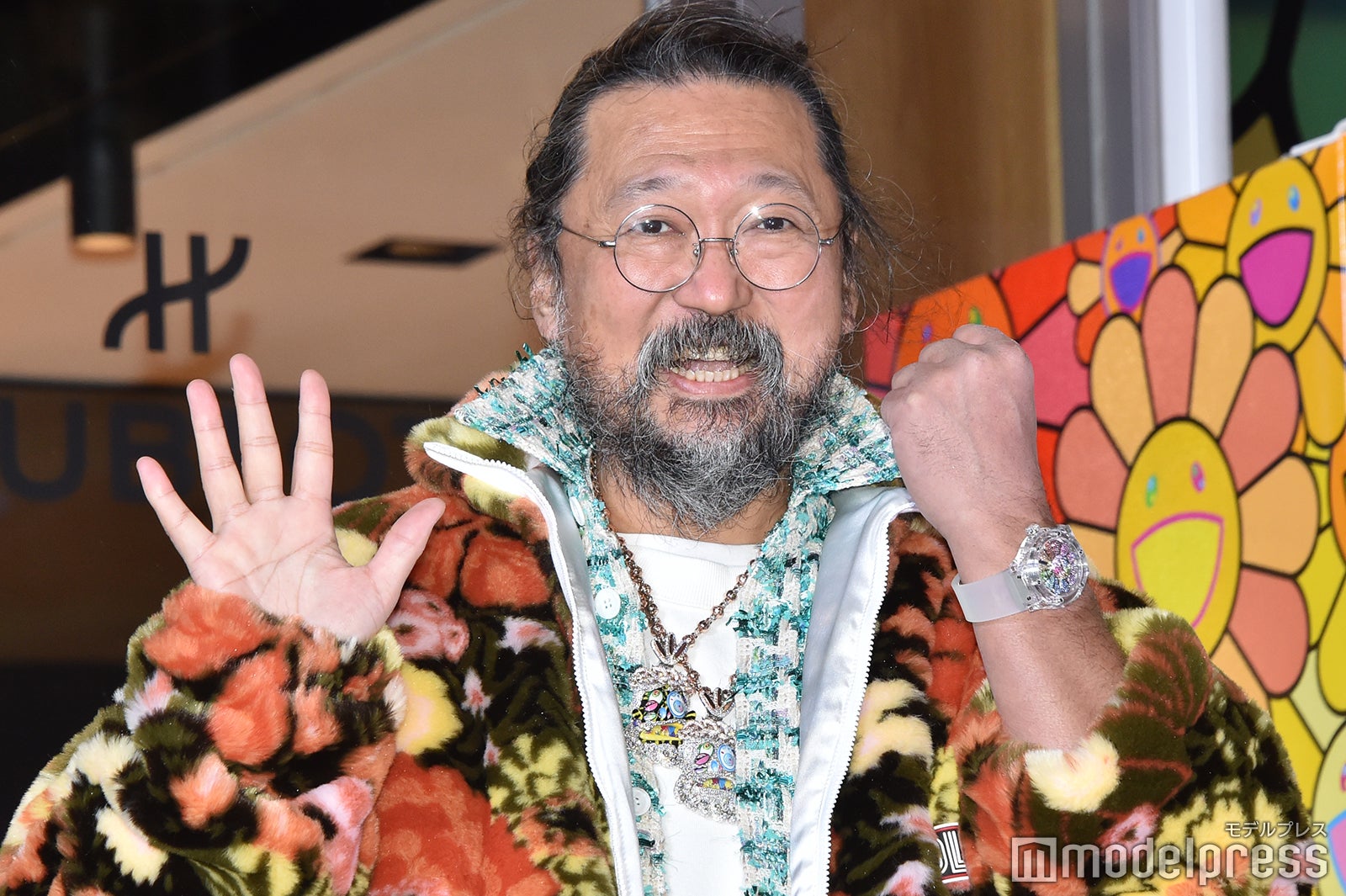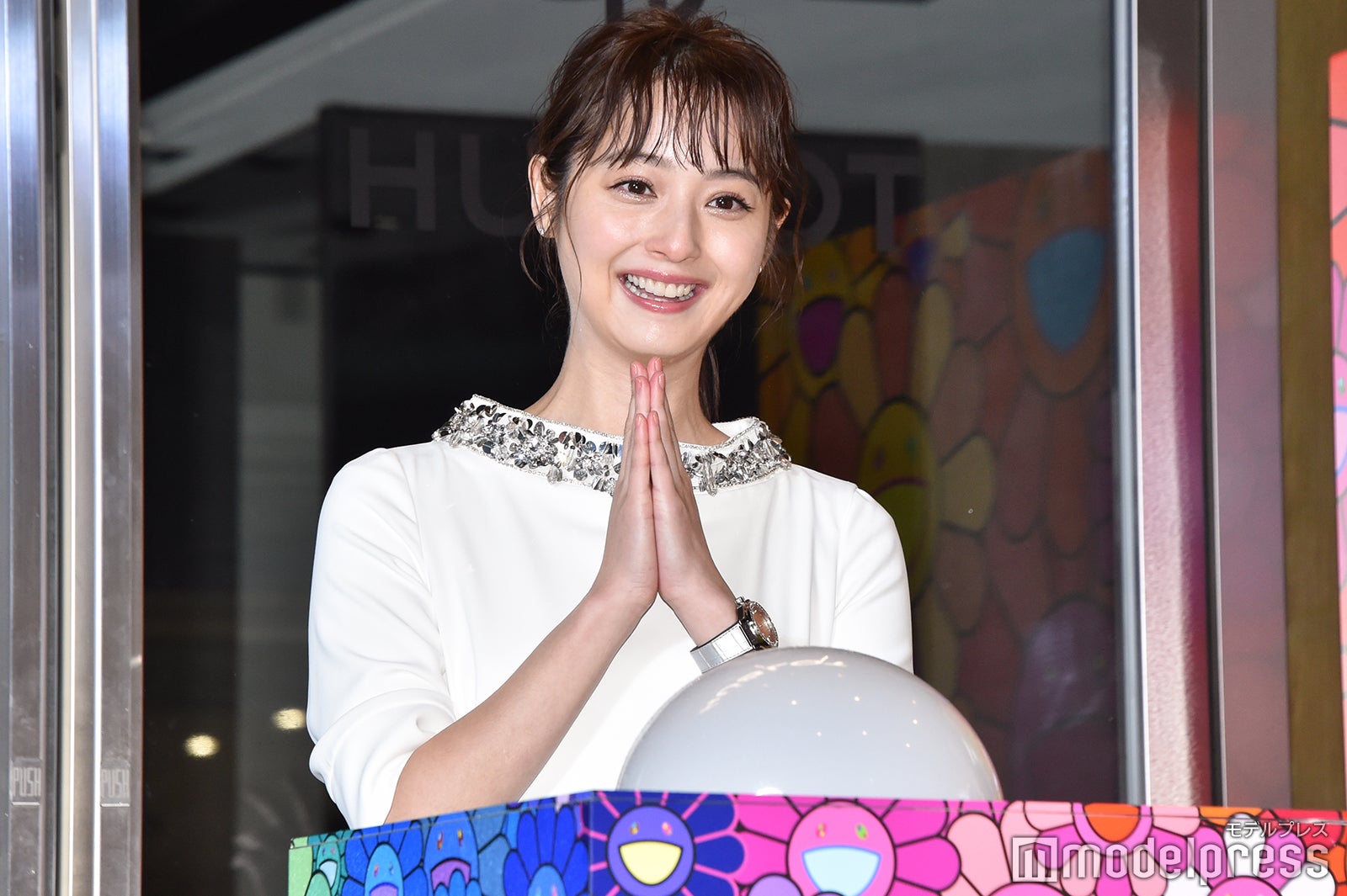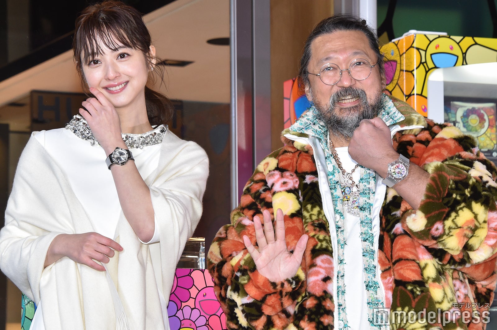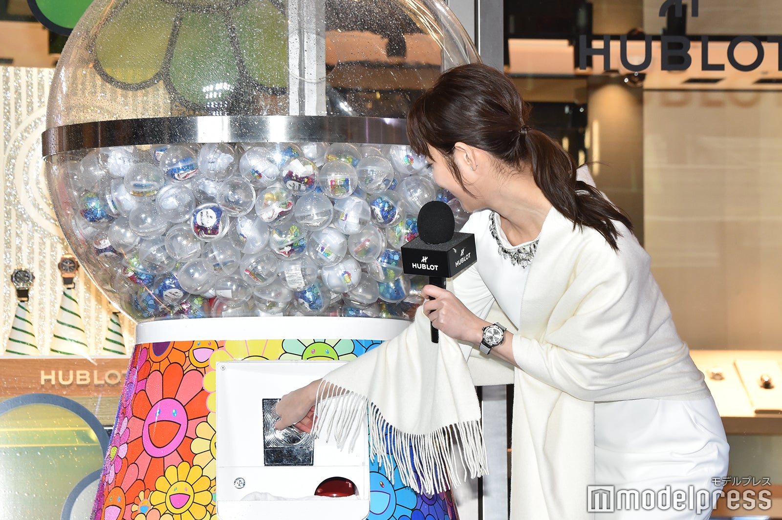 冷たい雨風が吹き付ける中、細身の純白ドレスを見にまとって登場し、報道陣や通行人を魅了した佐々木は、衣装のコンセプトを聞かれると「腕時計とビジューに合わせてクリスマスっぽいドレスを選びました」と答え、ゴスペルの生演奏をバックに、村上氏の有名な作品である“お花”で装飾された同店とクリスマスツリーの点灯式を行った。そして、改めて同店を見た感想を求められた佐々木は「カラフルでその空間にいるだけでウキウキしましたね。やっぱり“お花”を見ていてすごくハッピーな気持ちになりました。ずっと見ていたいですね」と目を輝かせた。