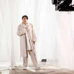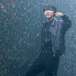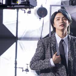 光沢のある三角形のステージに立ち、頭上から雨が降るセットを担当したのはオールブラックコーデを着こなすSHUNTO。屋内のスタジオにいながらも、ステージをセットするスタッフは雨合羽姿、SHUNTOもセットの中に入る時は傘が必須という異空間。雨に見立てた水を振り落とす仕掛けはステージの形に合わせてセットされており、SHUNTOに直接降りかかるものではないものの、ダンスがしづらい環境下。それでも、5歳からのダンス経験を活かし、あっという間にOKカットを撮り終えた。元気バージョン、クールバージョンの演技を難なくこなし、パフォーマンスの幅の広さを見せつけていた。