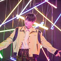 個人撮影の先陣を切ったのは、柄パンツに黄色のジャケットを華麗に着こなすRYUHEI。彼が担当したのはガードレールを背景にネオンを張り巡らせたセット、イメージは都会の街並み。照明の紐でつるされたネオン管の中を嬉しそうに潜りぬけ、「たのしいな」と声を漏らしていた。いざ、撮影が始まると、ネオン管にぶつからないように踊るのに苦戦しながらも、器用にダンスを披露。また、繊細な手つきや表情に加え、ブロアーによる髪のなびきで15歳にして大人顔負けのセクシーさも見せたRYUHEI。カメラに向かって投げキッスを送ったり、「もう一回!」という監督の声にも、「何回でもやります!」と爽やかな笑顔を見せ、会場を和ませまた。