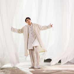 ゆらゆらと揺れる何枚もの生地を天井からつるし、「風」をイメージしたセットを飾ったのはLEO。彼の衣装であるオールホワイトコーデはまさに風を連想させ、シチュエーションにぴったり。カーテンが体に巻き付いてしまったり、顔にかぶってしまったりと動きを見せながらの難しい撮影も、笑顔やきめ顔を崩さず華麗に動き続ける。ブロアーを担当したメイクスタッフとも息ぴったりで、さらさらとゆれる髪の方向に合わせて自然に顔の動きをつけながらの撮影に挑んだ。画面チェックは念入りに行い、スタッフともたびたび意見を交換する勉強熱心なLEOだが、撮影後、ブロアーを顔の下から吹かせ、「鼻水凍り付いた!」と鼻を両手で覆っておちゃめな顔を見せ、スタッフを笑わせた。