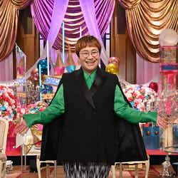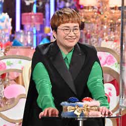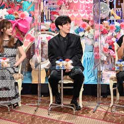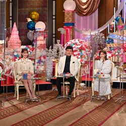 年越し特番ということで、この日の収録は都内の高級ホテル内のホールで実施。シャンデリアが照らす豪華な会場に、風船や花などで華やかにセットが組まれていた。スペシャルゲストとして佐藤が登場すると、田中みな実や弘中アナ、みちょぱから「フゥ~」という歓声が。スタジオメンバーからは思わず「あざといボタン」がロケットスタートで連打された。