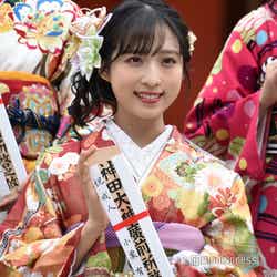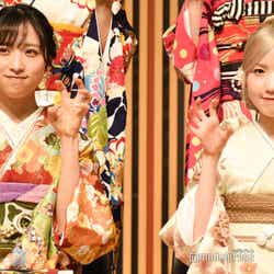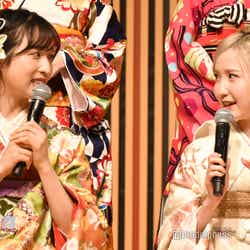 石綿:私はファンの頃に毎年見ていた成人式にこうして一員として一生に一度の大切な成人式を迎えて嬉しく思っています。私は自信満々でかっこいい女性に憧れているのでそうなれるように頑張ります。今日の振袖はここ(胸上)に小さいお花が2つついているのでそこが注目ポイントだと思っています。これからも感謝の気持ちを忘れず大人の自覚を持って頑張っていこうと思います。