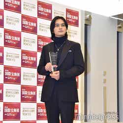 男性部門を受賞した北村。タートルネックの黒スーツで登場し、「伝統のある賞をいただけて光栄に思います。僕自身、ファッションも好きですし、ジュエリーと呼べるのかわからないですけど、ヴィンテージのアクセサリーを高校生からつけていました。好きなものをつけると背中を押されたり、きらびやかな日常になったのを覚えています」と喜びのコメントとともに回顧。「我々が届けるエンターテインメントもみなさんの日々を照らしていたりして、このような世の中ですが、勇気や背中を押させるよう賞をいただき、ジュエリーに負けないようにいろんなものに届けていきたいです」と新たな気持ちを語った。