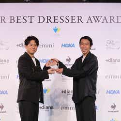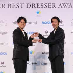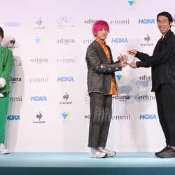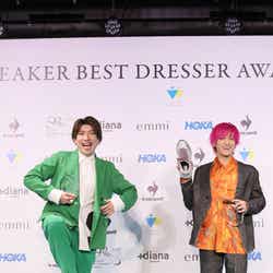芸人部門を受賞したEXIT。りんたろー。は「自分がただ好きで履いたり集めたりしたものが、こうやって評価されたことがすごく嬉しいです」と喜び。また、ファンがプレゼントでレアなスニーカーをくれることを明かし「僕1人でいただいたというよりは、僕とジッター(ファンの名称)でとったそんな賞かなと思います。なのでトロフィーを砕いてですね、ファクラブの方でシェアしたいと思います」とまさかの発言。これを聞いた兼近大樹は「最近熱愛が出まして。熱愛でファンがいなくなるんじゃないのかと怖くなって今すり寄ってます」と笑わせた。