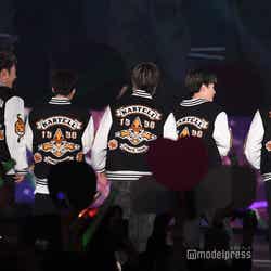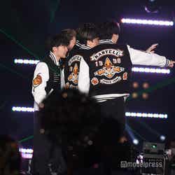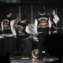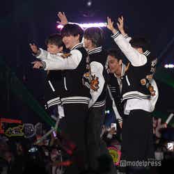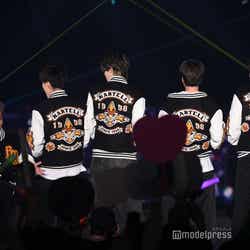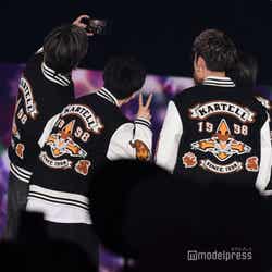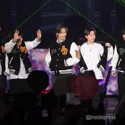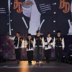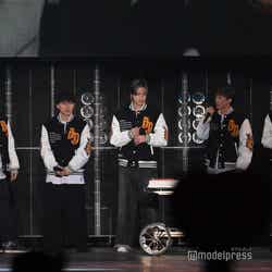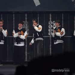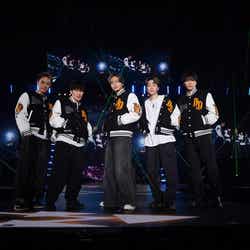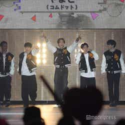 最新のレーザー演出で構成されたオープニングステージに一斉に登場したコムドット。5人のシルエットがモニターに映された瞬間、割れんばかりの拍手が送られた。お揃いのジャケットを着たコムドットは、ランウェイから駆けつけた会場中のファンにアピール。ランウェイのトップでは自撮りをするなど盛り上げた。