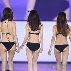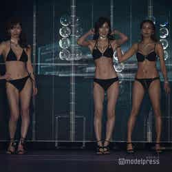 黒いビキニ姿で引き締まったボディと美しいバストを惜しげもなく披露。3人それぞれが妖艶にポージングし、会場の視線を集めた。