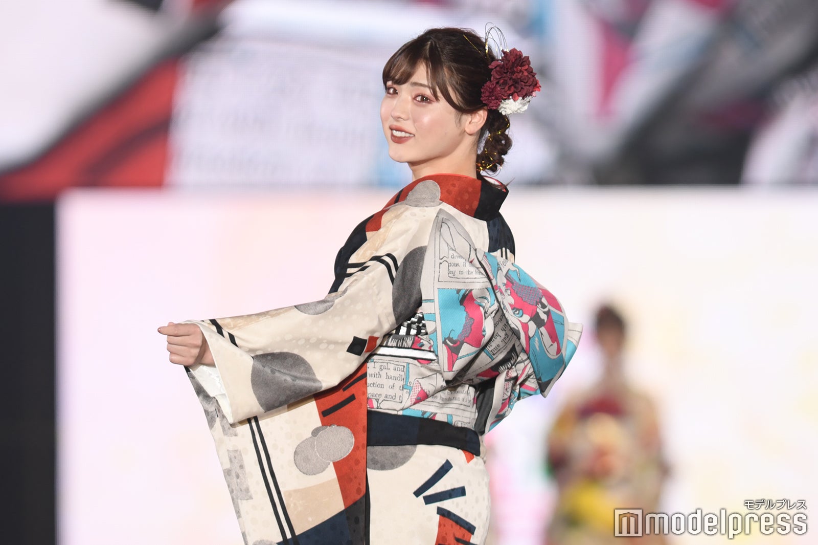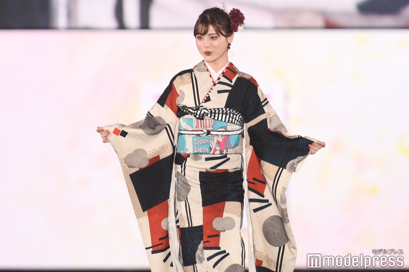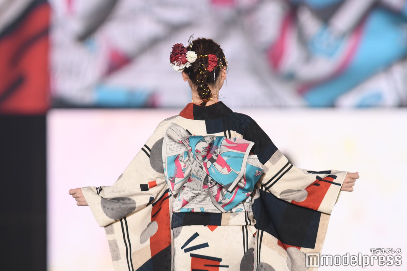今回が「関西コレクション」初登場となる井手上は振袖を着てランウェイを披露。「人生で初めて振袖を着たんですけどこのような機会をいただかないと着ることはないので貴重な機会をいただいたと思います」と初めて振袖に腕を通した感想をコメント。コミック柄の帯のユニークモダンという種類の振袖を「私らしさを出せるかなと思って」と選んだ理由を明かした。