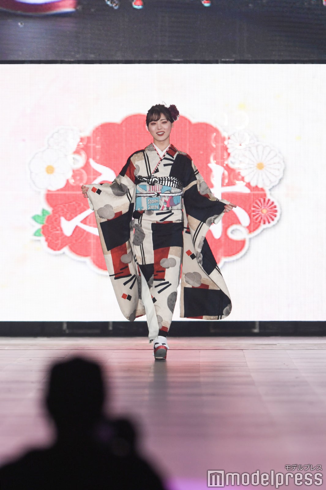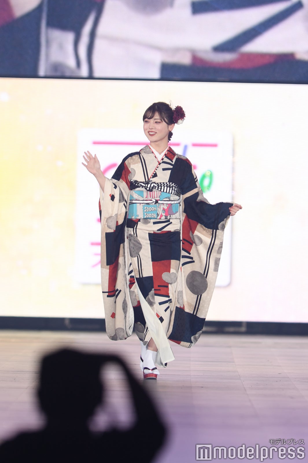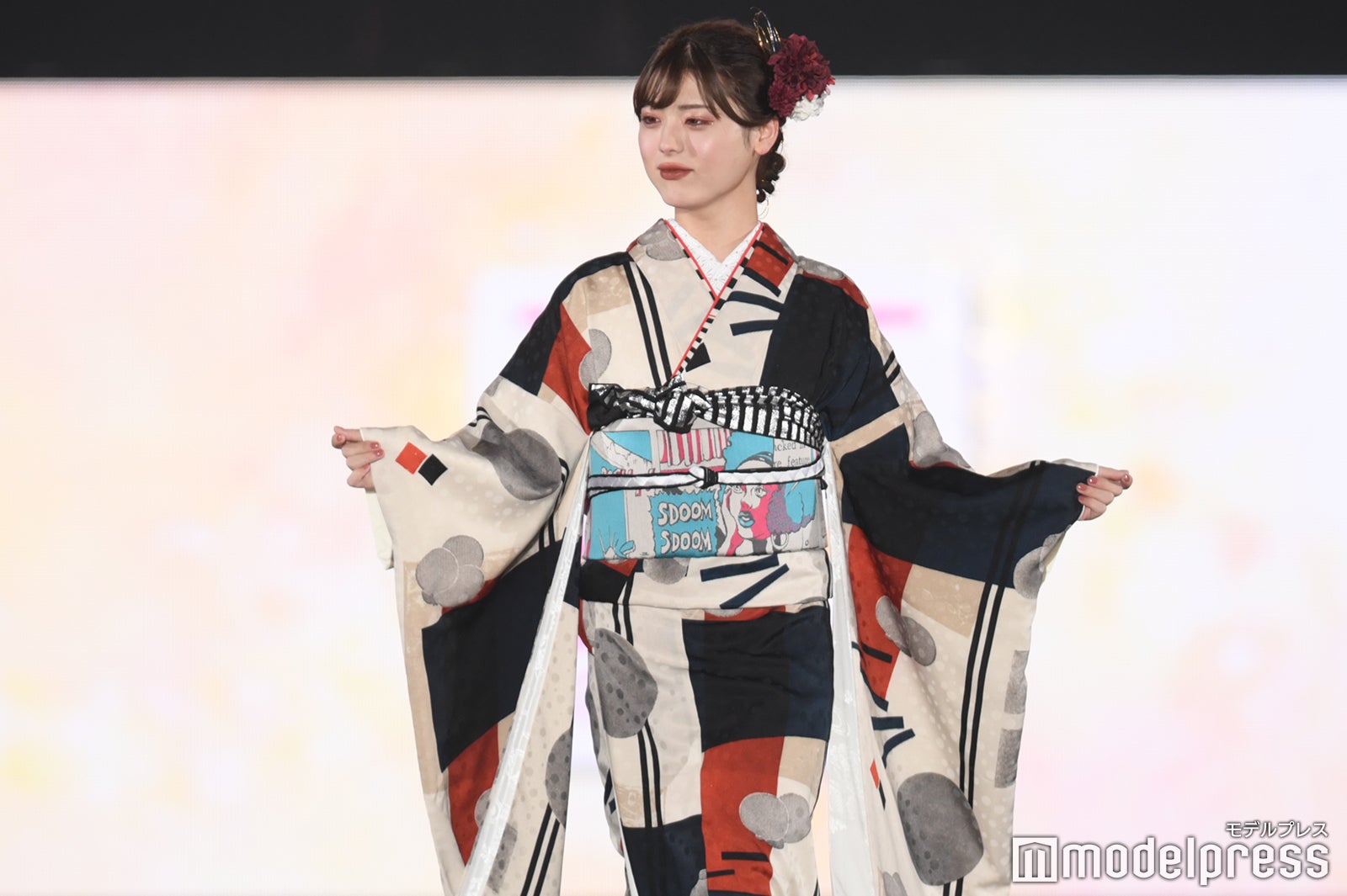 今回が「関西コレクション」初登場となる井手上は振袖を着てランウェイを披露。「人生で初めて振袖を着たんですけどこのような機会をいただかないと着ることはないので貴重な機会をいただいたと思います」と初めて振袖に腕を通した感想をコメント。コミック柄の帯のユニークモダンという種類の振袖を「私らしさを出せるかなと思って」と選んだ理由を明かした。