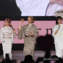 にこやかにウォーキングした3人は、ランウェイの先端でお馴染みの“見たらグイ”ポーズも披露。観客に向けて手を振るなど、ステージを楽しんでいた。