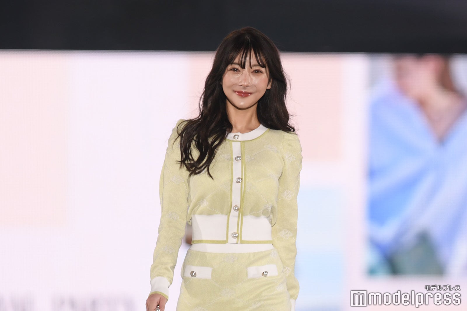 タイトスカートからはスラリとした美脚を覗かせ、ランウェイ先端では髪を耳にかけてから微笑み。可愛さと大人っぽさを兼ね備えた表情で観客を魅了した。