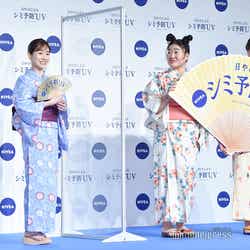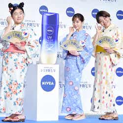 フリーアナウンサーで女優の田中みな実が8日、都内で行われた新TVCM発表会に、お笑いコンビ・ガンバレルーヤ(よしこ、まひる)とともに出席。浴衣姿で美しいうなじを披露した。