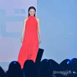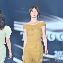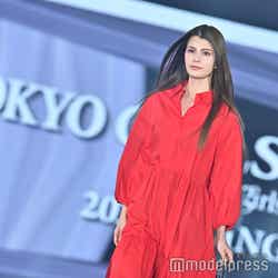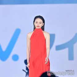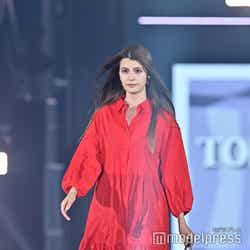 女優の山本舞香は2年ぶりTGC登場。美しい肩のラインが際立つ、真紅のホルターネックドレスに身を包み、クールにランウェイを歩いた。「ドクターホワイト」キャストが集結