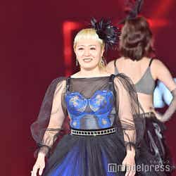 ダウンをスカートのように巻きつけ、印象的な衣装で登場した斎藤工は、補正下着をアレンジしたステージ衣装に身を包んだ女性モデルたち、美ボディを目指しサプライズ登場した丸山桂里奈と共演。ランウェイ後には、感染対策用の手袋を膨らませ、いくつもつなぎ合わせたものを“たすき”のようにかけたインパクトある姿で再登場した。