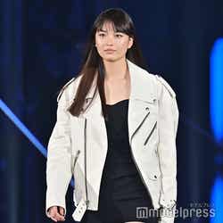 最初のステージに登場した茅島は、白いライダースに黒のミニ丈ボトムのモノクロコーデで登場。ミニ丈ボトムからは、スラリと伸びる美しい脚を惜しげもなく見せ、堂々のランウェイを披露した。