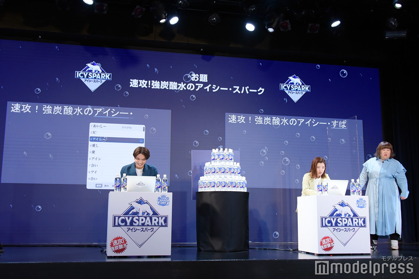 俳優の磯村勇斗が31日、都内で行われた強炭酸水の新CM発表会にお笑いトリオ・3時のヒロインの福田麻貴、かなでとともに出席。かなでから公開告白される場面があった。