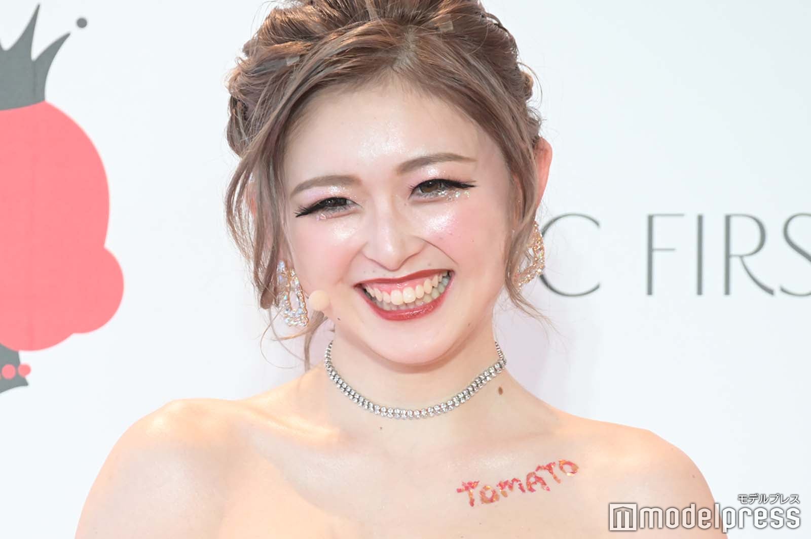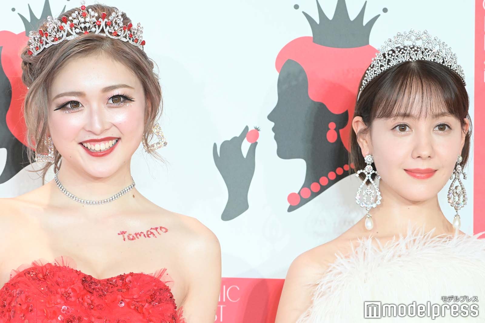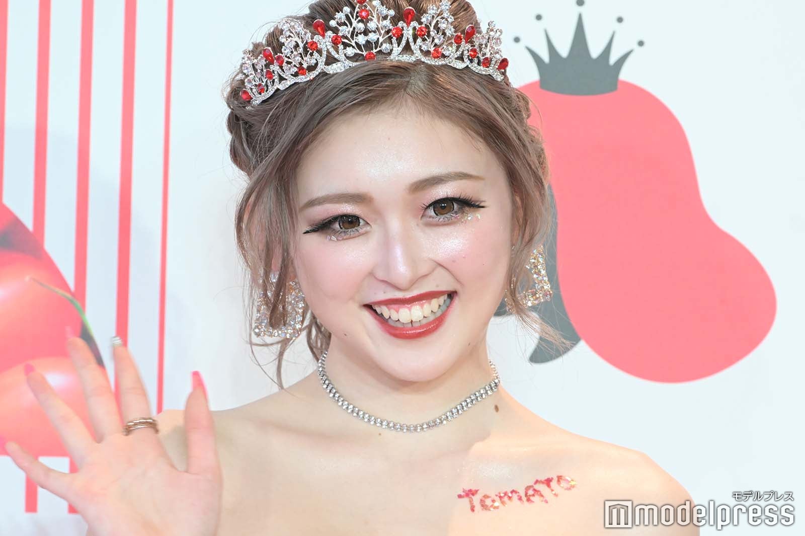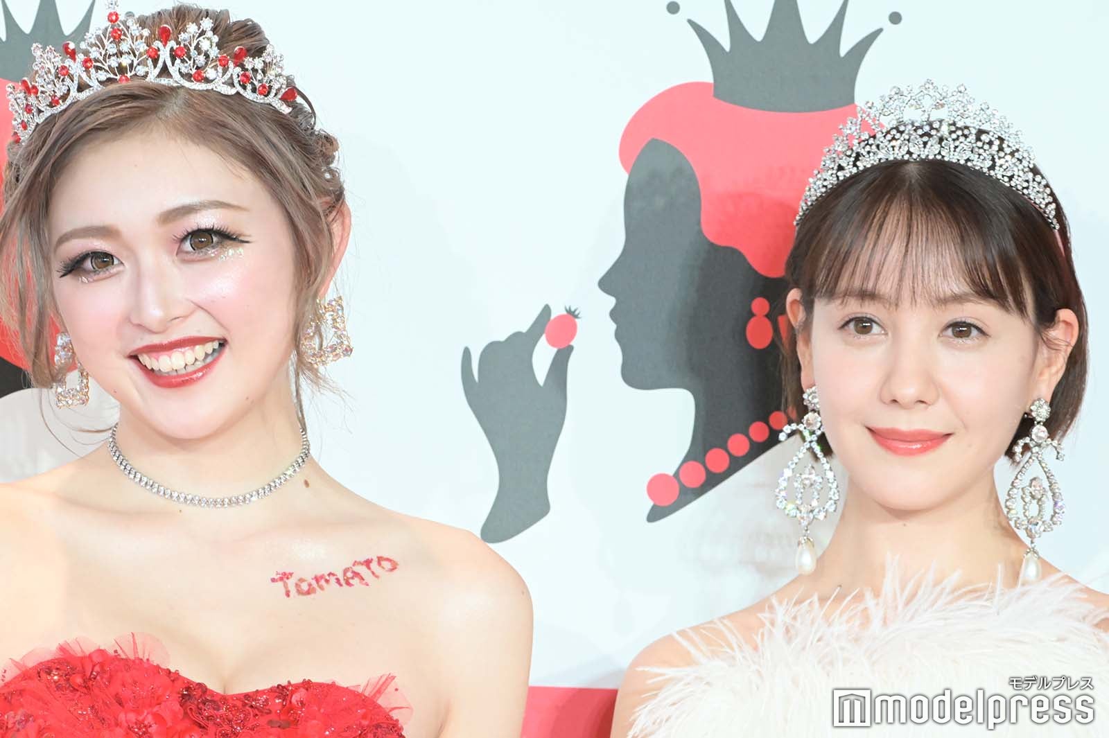 真っ赤なドレスに身を包んだゆうちゃみは「トマトを意識させていただきまして。トマトのプリンセスを意識したコーデになっております」とポイントを紹介。トリンドルは「QUEENということで、シルバーだったり、白っぽい衣装を着させていただきました。リップにトマトの色を入れてみました」と白い歯を見せた。