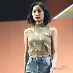 小川はタイトなノースリーブトップスにセミフレアデニムを合わせた、美しいスタイルの際立つコーディネートで登場。肩から二の腕の引き締まったラインで魅せた。ヌーディなブラウンリップで大人な雰囲気を漂わせ、ランウェイトップでは髪をかきあげSEXYにポーズを決めていた。