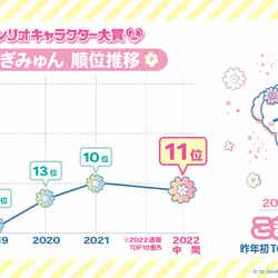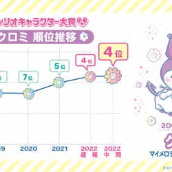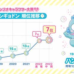 4位の「クロミ」(昨年5位)、7位の「ハンギョドン」(昨年13位)も勢いを落とすことなく上位をキープしており、「クロミ」が初めて「マイメロディ」を抑えて上位入賞できるかどうか注目。その「マイメロディ」(昨年4位)は、速報発表から1つ順位を上げて「ハローキティ」(昨年6位)を抜き、5位にランクインする健闘を見せている。また、速報発表時にはTOP10圏外だった「けろけろけろっぴ」(昨年15位)が10位に入り追い上げを見せるなど、「はぴだんぶい」メンバーのラストスパートにも注目だ。