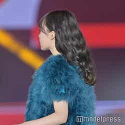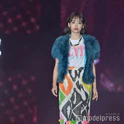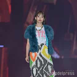 グループ2期生の濱岸はファッション雑誌『with』の専属モデルとして活躍。身長167cmのスタイルが活かされたロングスカート姿でクールにランウェイウォーク。ファー素材のジャケットを羽織り、ワンランク上の組み合わせを披露した。