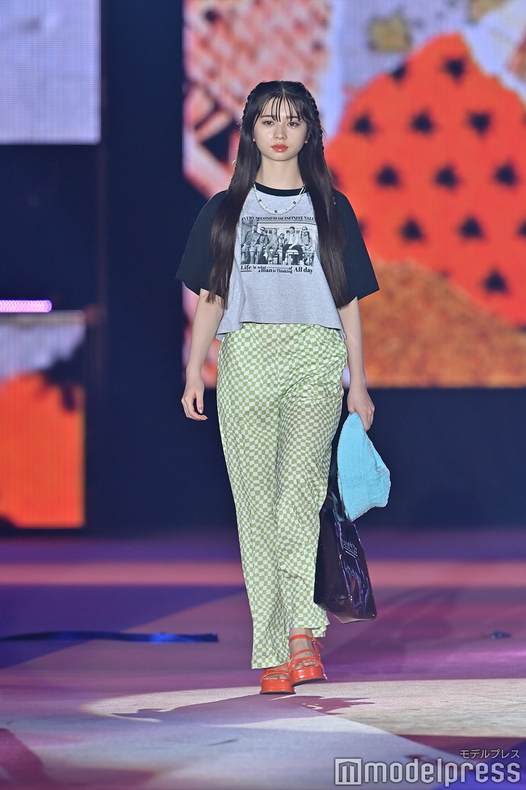 「Seventeen」専属モデル21人が集結したステージに登場した桜田。2000年代に流行した“Y2K”ファッションをテーマに、ビッグTシャツにグリーンのパンツ、オレンジのサンダルを合わせたビタミンカラーのコーディネートを披露した。