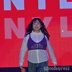 また、ステージトップでは持っていたバックを頭に乗せ、“舌ペロ”と“ウインク”のポーズ。ノリノリでランウェイを歩いた。