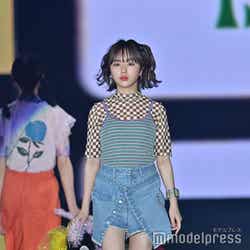 また、ボトムには変形のデニムスカートを着用。白肌輝く美脚でランウェイをウォーキングした。