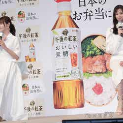 2人は商品のアンバサダーに就任。それぞれの名前が入った大きな名刺が送られ、深田が「本当に嬉しい。お弁当との組み合わせを多くの人にオススメできるよう頑張りたい」と話すと、中条も「歴史ある商品のアンバサダーは光栄で嬉しく思う。お弁当に合うとCMで実感できたので、感動と発見をたくさんの人に広めたいです。深田さんと一緒にアンバサダーとして皆さんに感動してもらえたら」と意気込んだ。この日は商品とお弁当のペアリングを体験。鮭弁当を食べた後、商品を一口飲んだ深田は「美味しいです。無糖の後味がスッキリしてお弁当に合いますね。相性抜群でした」とコメント。唐揚げ弁当を食べた中条も「唐揚げのジューシーさや油っぽさとスッキリさが合いますね。ほのかに紅茶の香りがする。ゴクゴク飲みたくなる」と話し、アンバサダーとして商品をアピールした。