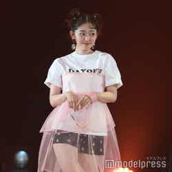 お団子ヘアに前髪をくるんと巻いたキュートなヘアスタイルで登場。白いTシャツにピンクのチュールキャミソールをレイヤードした遊び心溢れるファッションを披露した。ショートパンツの下からはスラリと美しい脚があらわに。またサングラスをちらりと外したお茶目なポージングで会場を沸かせた。