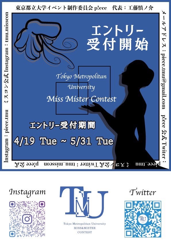 昨年度に引き続き東京都立大学ミス&ミスターコンテストを主催させていただく、東京都立大学イベント制作委員会p!eceと申します。我々は「イベントを通して都立大を盛り上げる」を理念に活動していて、ミスコンの他にも、5月には新入生対象の「クラス選手権」、12月には都立大のサークル・部活動対象の「サークル選手権」という都立大最大規模のイベントを企画・運営しております。我々と一緒にミスコンファイナリストとして、都立大学を盛り上げていきませんか?たくさんのご応募お待ちしております!💍エントリー受付開始💍