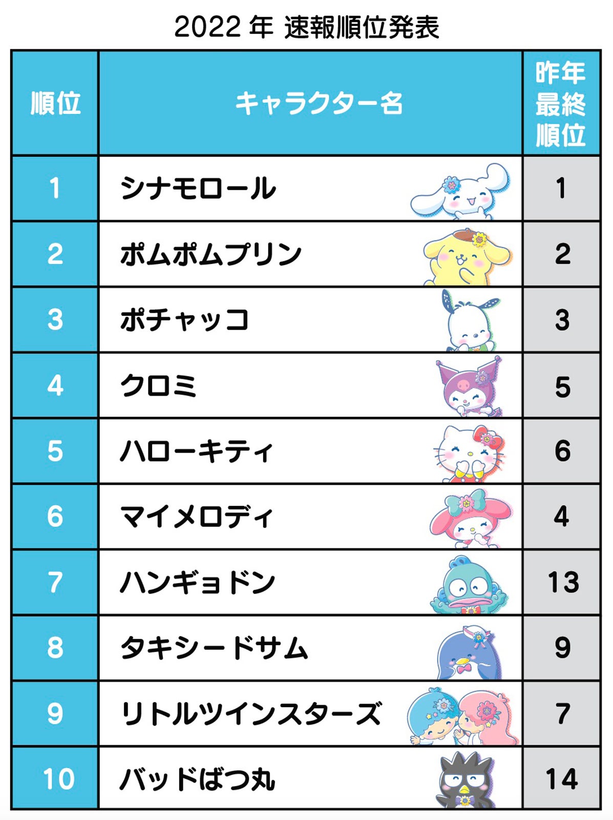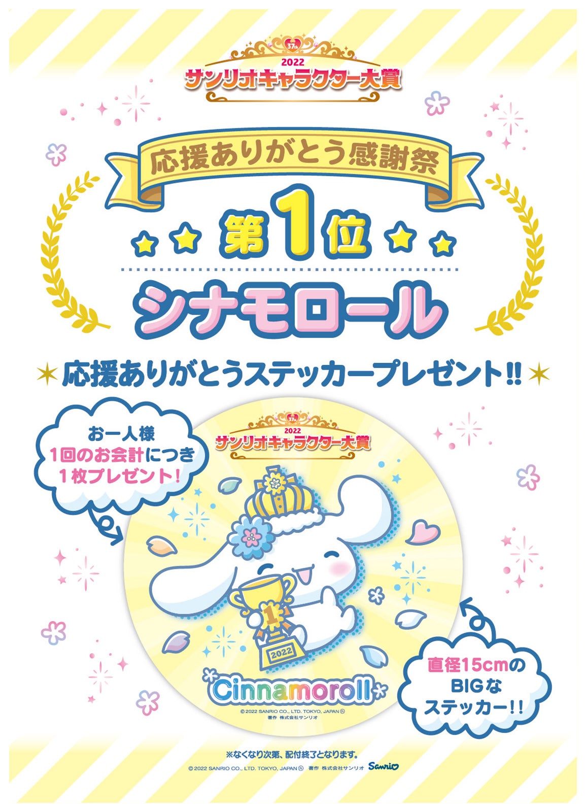 4月8日から開催しているサンリオキャラクターの人気投票企画「2022年サンリオキャラクター大賞」の最終結果が発表。シナモロールが1位となった。