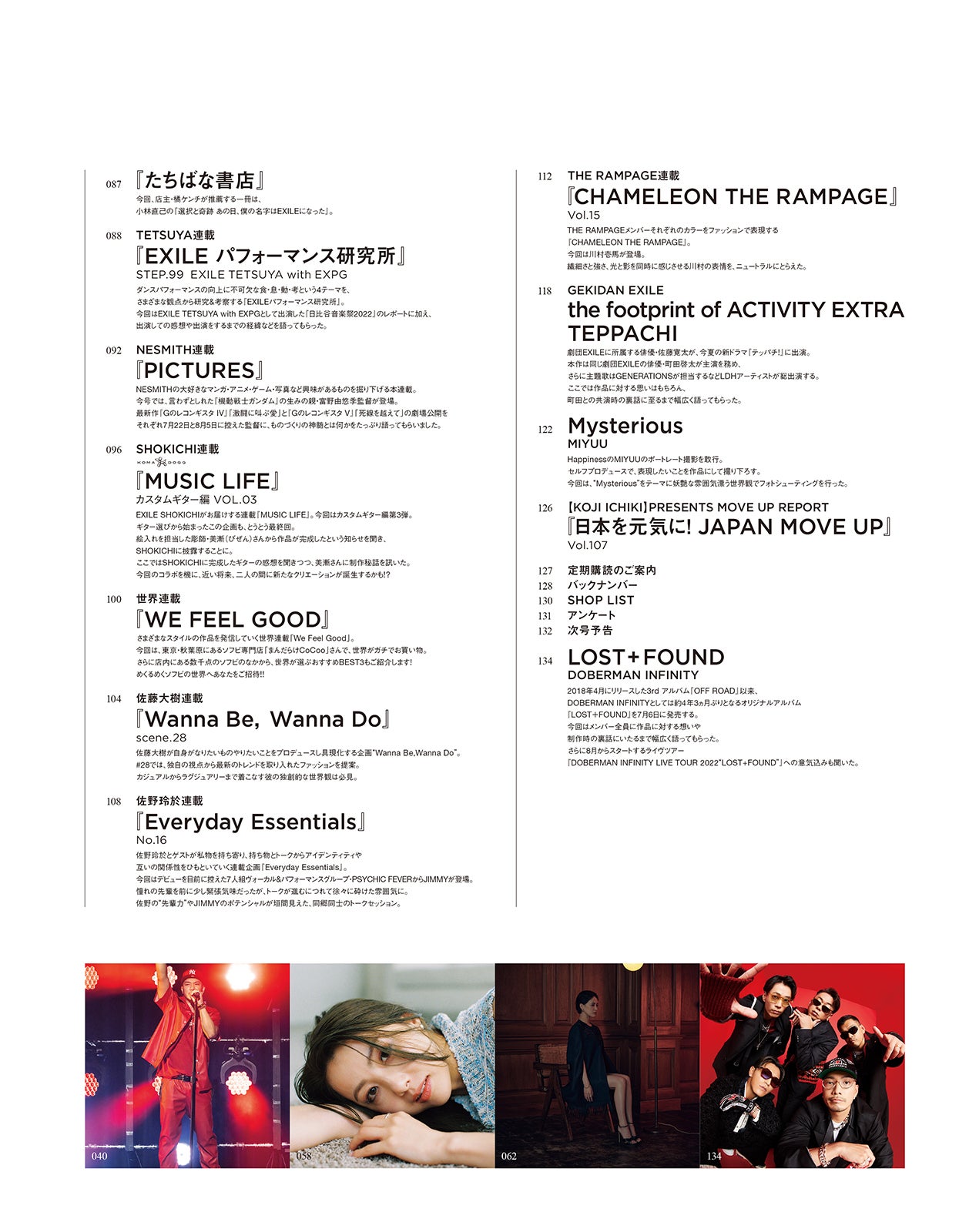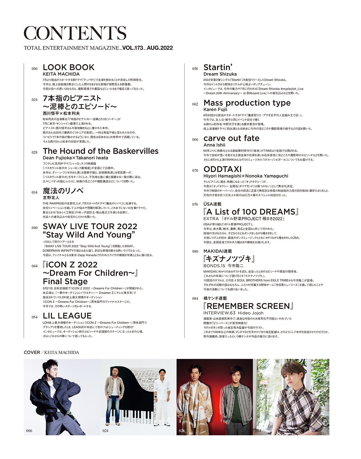 その他の特集では、7月6日に約4年3ヵ月ぶりとなるオリジナルアルバム『LOST+FOUND』をリリースするDOBERMAN INFINITYが登場。今回はメンバー全員に作品に対する想いや制作時の裏話について語った。さらに8月からスタートするライヴツアー『DOBERMAN INFINITY LIVE TOUR 2022“LOST+FOUND”』への意気込みも。なお今号の裏表紙は彼らが飾る。そのほか、7月24日から上演の舞台『7本指のピアニスト~泥棒とのエピソード~』で主演の松本利夫とピアニスト・西川恒平とのスペシャル対談や現在公開中の映画『バスカヴィル家の犬 シャーロック劇場版』で再びバディを組んだディーン・フジオカと岩田剛典の対談インタビューなど、今号も充実した内容になっている。(modelpress編集部)