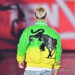 鮮やかなグリーンとイエローが映えるコーディネートで堂々と手を振ってランウェイ。音楽に合わせてノリノリで歩き、戦う意志を示す構えのファイティングポーズやシャドウも決めていた。