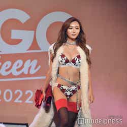 「ミスマガジン2022」ベスト16にも選ばれたれいたぴは、今回も圧巻の美ボディを披露。白地に薔薇がデザインされた華やかなランジェリーにゴージャスなファーベストを羽織った姿で堂々とランウェイを歩いた。