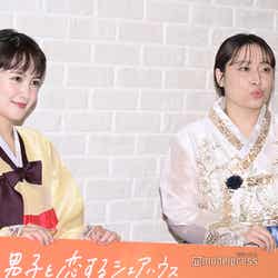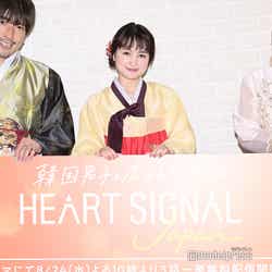 3人がスタジオMCを務める「HEART SIGNAL JAPAN」は、若者を中心に人気を集める韓国発の人気No.1恋愛番組「HEART SIGNAL」を、ABEMAが日本初リメイクしたもの。日韓共同制作の「HEART SIGNAL JAPAN」として新たに放送をスタートする。番組では韓国男子と日本女子が韓国の地でシェアハウスをしながら恋模様を繰り広げる。MCの3人は韓国の民族衣装で取材に応じた。